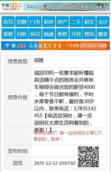 诚招司机一名要求能听懂临县话精干点的男孩会开商务车稍微会做点饭的薪资4000,每个节日都有福利,平时水果零食不断,最好是30岁以内,联系电话:17835142455 【电话咨询时,请一定说明在太原生活网看到的,谢谢!】 |