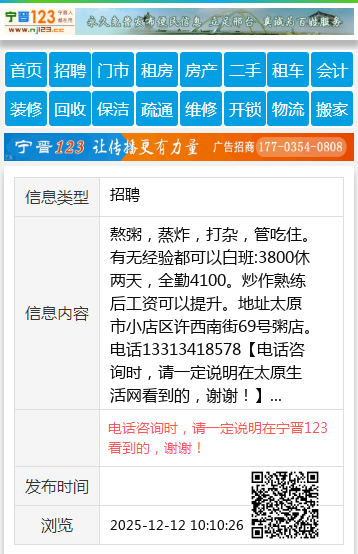 熬粥,蒸炸,打杂,管吃住。有无经验都可以