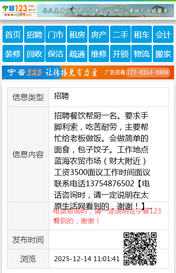 招聘餐饮帮厨一名。要求手脚利索,吃苦耐劳,主要帮忙给老板做饭。会做简单的面食,包子饺子。工作地点蓝海农贸市场(财大附近)工资3500面议工作时间面议联系电话13754876502 【电话咨询时,请一定说明在太原生活网看到的,谢谢!】 |