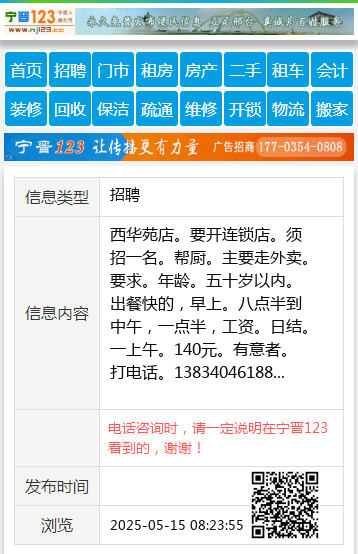 西华苑店。要开连锁店。须招一名。帮厨。主要走外卖。要求。年龄。五十岁以内。出餐快的,早上。八点半到中午,一点半,工资。日结。一上午。140元。有意者。打电话。13834046188 【电话咨询时,请一定说明在太原生活网看到的,谢谢!】 |