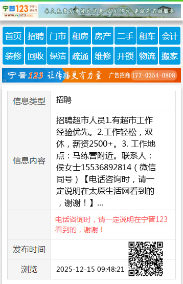 联系人:侯女士15536892814(微信同号) 【电话咨询时,请一定说明在太原生活网看到的,谢谢!】 |
