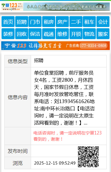 单位食堂招聘,前厅服务员女4名,工资2800,月休四天,国家节假日休息,工资每月准时发放管吃管住,联系电话:刘13934561626地址:南中环长治路口 【电话咨询时,请一定说明在太原生活网看到的,谢谢!】 |