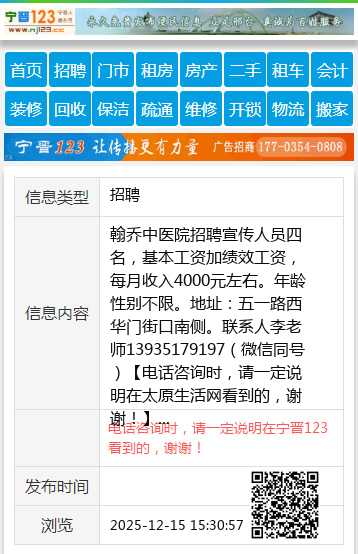 翰乔中医院招聘宣传人员四名,基本工资加绩效工资,每月收入4000元左右。年龄性别不限。地址:五一路西华门街口南侧。联系人李老师13935179197(微信同号) 【电话咨询时,请一定说明在太原生活网看到的,谢谢!】 |