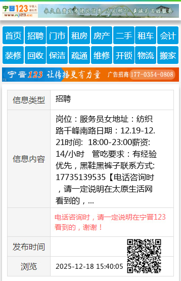 | 防骗提醒: | 太原生活网(www.sxtaiyuan.net)提醒您:手工活、网络兼职、刷单,都是骗子!凡以各种名义收取费用的都是骗子!找工作是往兜里挣钱,让你往外掏钱的都是骗子!异地招聘请提高警惕,谨防诈骗! |