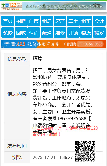 招工,男女各两名,男,年龄40以内,要求身体健康,能吃苦耐劳,识字,会开三轮主要工作负责日常配货发货卸货,工作地点,太原尖草坪小商品,会开车者优先。女,主要门市卫生开票卖货。有意者联系18636925588 【电话咨询时,请一定说明在太原生活网看到的,谢谢!】 |