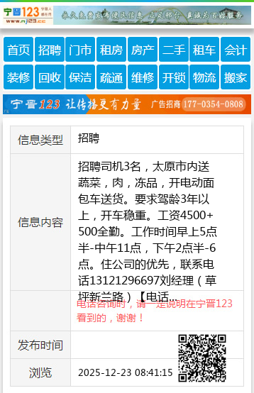 招聘司机3名,太原市内送蔬菜,肉,冻品,开电动面包车送货。