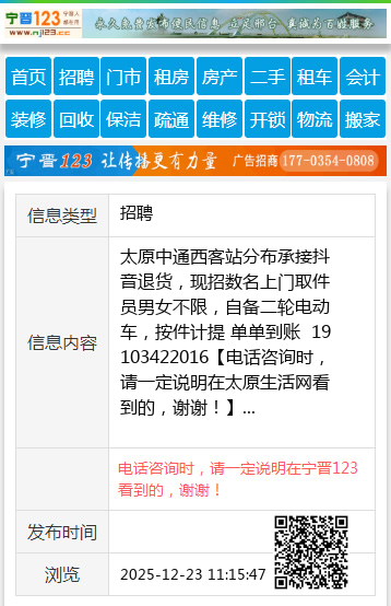 太原中通西客站分布承接抖音退货,现招数名上门取件员男女不限,自备二轮电动车,按件计提 单单到账 19103422016 【电话咨询时,请一定说明在太原生活网看到的,谢谢!】 |