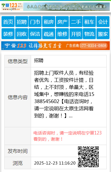 招聘上门取件人员,有经验者优先,工资按件计提,日结,上不封顶,单量大,区域集中,想赚钱的来电话15388545602 【电话咨询时,请一定说明在太原生活网看到的,谢谢!】 |