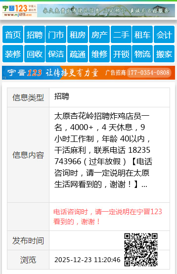 太原杏花岭招聘炸鸡店员一名,4000+,4 天休息,9 小时工作制,年龄 40以内,干活麻利,联系电话 18235743966(过年放假) 【电话咨询时,请一定说明在太原生活网看到的,谢谢!】 |