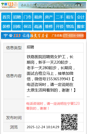 铁路医院招聘男女护工,长期岗,新手一天220起步,老手一天280起步,长期岗,面试合格立马上,接单加微信,微信号15536539943 【电话咨询时,请一定说明在太原生活网看到的,谢谢!】 |
