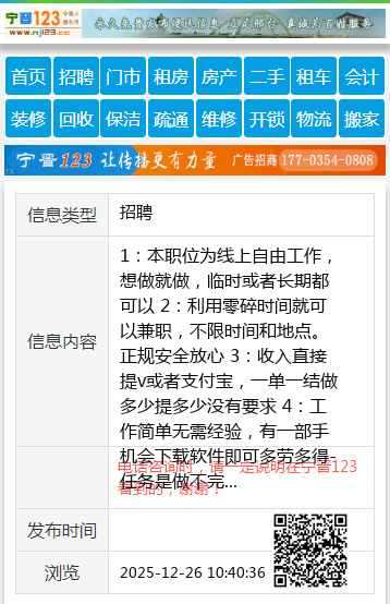 1:本职位为线上自由工作,想做就做,临时或者长期都可以 2:利用零碎时间就可以兼职,不限时间和地点。正规安全放心 3:收入直接提v或者支付宝,一单一结做多少提多少没有要求 4:工作简单无需经验,有一部手机会下载软件即可多劳多得-任务是做不完 5:平均每小时25元以上每天150左右,平台稳定长期可做的 6:完全免费,任何收费的兼职都是骗人的。。。 加入方式: 添加QQ群:8 8 3 8 5 4 5 7 1 【电话咨询时,请一定说明在太原生活网看到的,谢谢!】 |