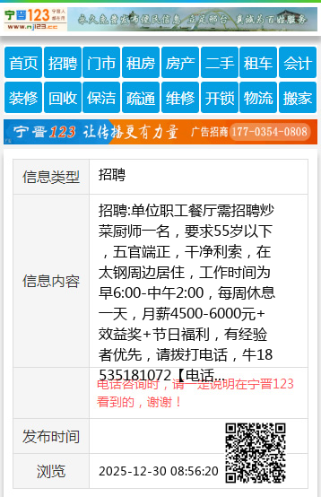 招聘:单位职工餐厅需招聘炒菜厨师一名,要求55岁以下,五官端正,干净利索,在太钢周边居住,工作时间为早6:00-中午2:00,每周休息一天,月薪4500-6000元+效益奖+节日福利,有经验者优先,请拨打电话,牛18535181072 【电话咨询时,请一定说明在太原生活网看到的,谢谢!】 |
