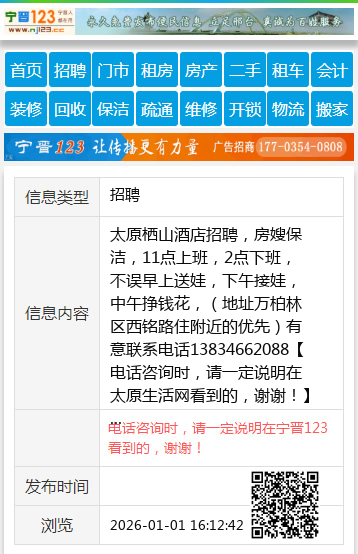 太原栖山酒店招聘,房嫂保洁,11点上班,2点下班,不误早上送娃,下午接娃,中午挣钱花,(地址万柏林区西铭路住附近的优先)有意联系电话13834662088 【电话咨询时,请一定说明在太原生活网看到的,谢谢!】 |