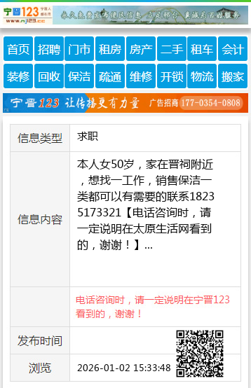 本人女50岁,家在晋祠附近,想找一工作,销售保洁一类都可以有需要的联系18235173321