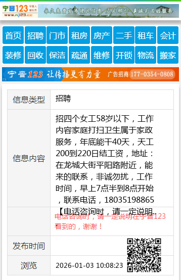 家庭打扫卫生属于家政服务,年底能干40天,天工200到220日结工资,地址:在龙城大街平阳路附近,能来的联系,非诚勿扰,工作时间,早上7点半到8点开始,联系电话,18035198865 【电话咨询时,请一定说明在太原生活网看到的,谢谢!】 |