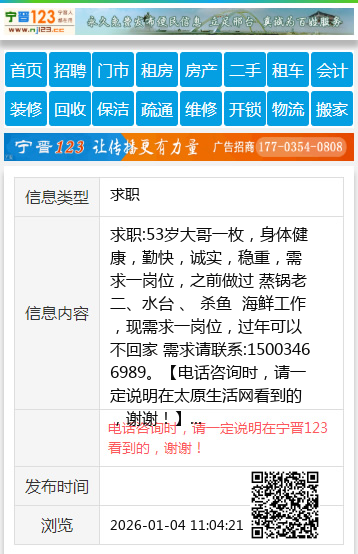 求职:53岁大哥一枚,身体健康,勤快,诚实,稳重,需求一岗位,之前做过 蒸锅老二、水台 、 杀鱼 海鲜工作,现需求一岗位,过年可以不回家 需求请联系:15003466989。 【电话咨询时,请一定说明在太原生活网看到的,谢谢!】 |