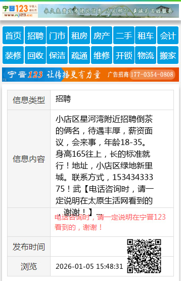 小店区星河湾附近招聘倒茶的俩名,待遇丰厚,薪资面议,会来事,年龄18-35。身高165往上,长的标准就行!