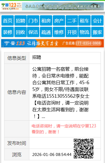 公寓招聘一名宿管,前台接待,会日常水电维修,能配合公寓其他日常工作,45-65岁,男女不限/待遇面谈联系电话15513055562李女士 【电话咨询时,请一定说明在太原生活网看到的,谢谢!】 |