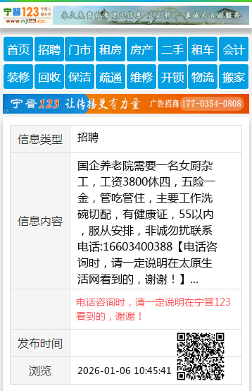 国企养老院需要一名女厨杂工,工资3800休四,五险一金,管吃管住,主要工作洗碗切配,有健康证,55以内,服从安排,非诚勿扰联系电话:16603400388 【电话咨询时,请一定说明在太原生活网看到的,谢谢!】 |