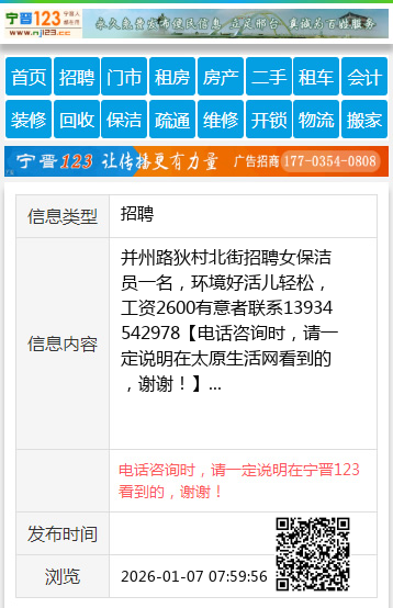 并州路狄村北街招聘女保洁员一名,环境好活儿轻松,工资2600有意者联系13934542978