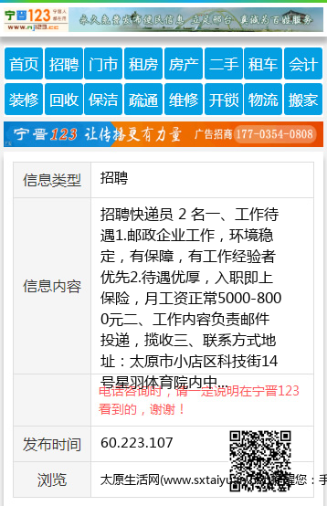 | 防骗提醒: | 太原生活网(www.sxtaiyuan.net)提醒您:手工活、网络兼职、刷单,都是骗子!凡以各种名义收取费用的都是骗子!找工作是往兜里挣钱,让你往外掏钱的都是骗子!异地招聘请提高警惕,谨防诈骗! |