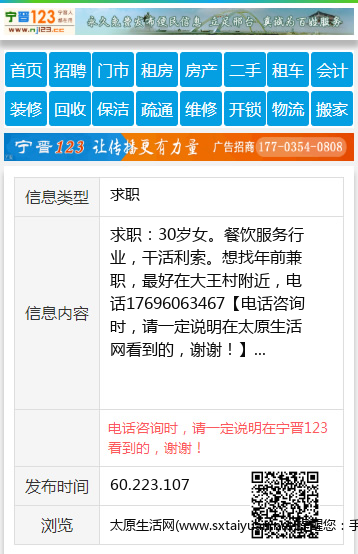 求职:30岁女。餐饮服务行业,干活利索。想找年前兼职,最好在大王村附近,电话17696063467