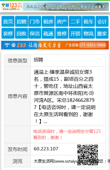 通溢上·臻享温泉诚招女搓3名,提成15,副项百分之四十,管吃住,地址山西省太原市晋源区南中环街阳光·汾河湾A区。宋总18246628797 【电话咨询时,请一定说明在太原生活网看到的,谢谢!】 |