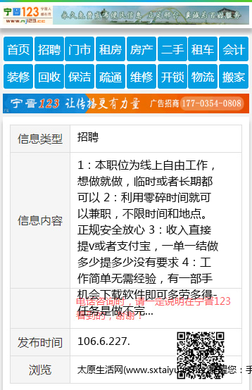 1:本职位为线上自由工作,想做就做,临时或者长期都可以 2:利用零碎时间就可以兼职,不限时间和地点。正规安全放心 3:收入直接提v或者支付宝,一单一结做多少提多少没有要求 4:工作简单无需经验,有一部手机会下载软件即可多劳多得-任务是做不完 5:平均每小时25元以上每天150左右,平台稳定长期可做的 6:完全免费,任何收费的兼职都是骗人的。。。 加入方式: 添加QQ群:8 8 3 8 5 4 5 7 1 【电话咨询时,请一定说明在太原生活网看到的,谢谢!】 |