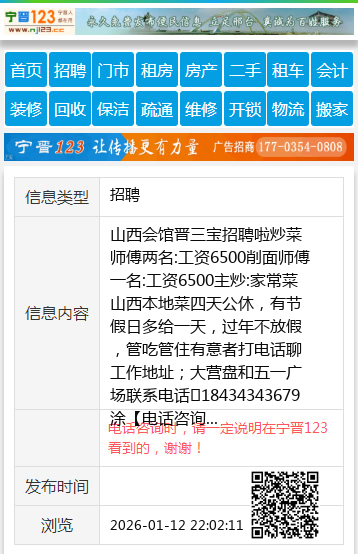 山西会馆晋三宝招聘啦炒菜师傅两名: