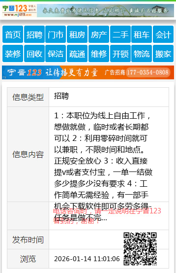 1:本职位为线上自由工作,想做就做,临时或者长期都可以 2:利用零碎时间就可以兼职,不限时间和地点。正规安全放心 3:收入直接提v或者支付宝,一单一结做多少提多少没有要求 4:工作简单无需经验,有一部手机会下载软件即可多劳多得-任务是做不完 5:平均每小时25元以上每天150左右,平台稳定长期可做的 6:完全免费,任何收费的兼职都是骗人的。。。 加入方式: 添加QQ群:8 8 3 8 5 4 5 7 1 【电话咨询时,请一定说明在太原生活网看到的,谢谢!】 |