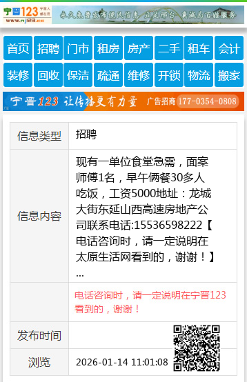 | 防骗提醒: | 太原生活网(www.sxtaiyuan.net)提醒您:手工活、网络兼职、刷单,都是骗子!凡以各种名义收取费用的都是骗子!找工作是往兜里挣钱,让你往外掏钱的都是骗子!异地招聘请提高警惕,谨防诈骗! |