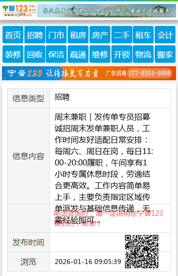 诚招周末发单兼职人员,工作时间友好适配日常安排:每周六、周日在岗,每日11:00-20:00履职,午间享有1小时专属休息时段,劳逸结合更高效。工作内容简单易上手,主要负责指定区域传单派发与基础信息传递,无需经验即可快速胜任。薪资待遇明确透明,单日薪酬私聊,完工及时结算。有意者可直接联系:18935138867(微信同步),名额有限,先到先得。 【电话咨询时,请一定说明在太原生活网看到的,谢谢!】 |