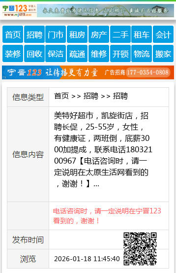 美特好超市,凯旋街店,招聘长促,25-55岁,女性,有健康证,两班倒,底薪3000加提成,联系电话18032100967 【电话咨询时,请一定说明在太原生活网看到的,谢谢!】 |