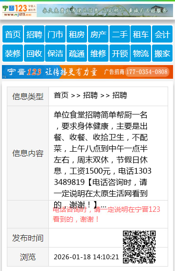 单位食堂招聘简单帮厨一名,要求身体健康,主要是出餐、收餐、收拾卫生,不配菜,上午八点到中午一点半左右,周末双休,节假日休息,工资1500元,电话13033489819 【电话咨询时,请一定说明在太原生活网看到的,谢谢!】 |