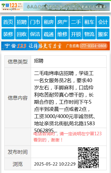 二毛电烤串店招聘,学徒工一名女服务员2名,要求40岁左右,手脚麻利,口齿伶利吃苦耐劳真心想干的,长期合作的,工作时间下午5点半到凌晨一点或者2点,工资3000/4000元非诚勿扰、地址亲贤北街航苑北路15835062895 【电话咨询时,请一定说明在太原生活网看到的,谢谢!】 |