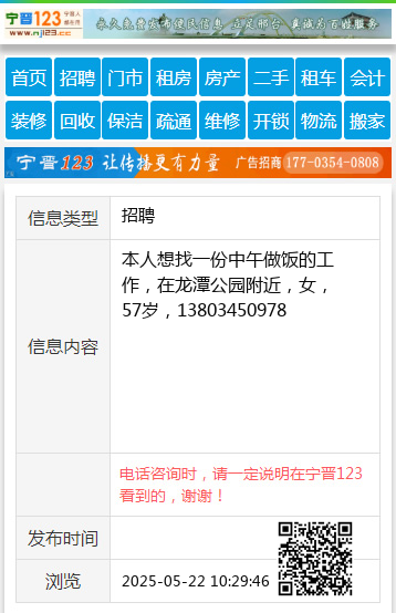 本人想找一份中午做饭的工作,在龙潭公园附近,女,57岁,13803450978