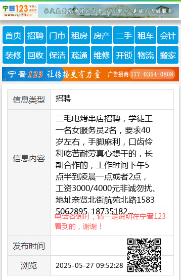 二毛电烤串店招聘,学徒工一名女服务员2名,要求40岁左右,手脚麻利,口齿伶利吃苦耐劳真心想干的,长期合作的,工作时间下午5点半到凌晨一点或者2点,工资3000/4000元非诚勿扰、地址亲贤北街航苑北路15835062895-18735182895 【电话咨询时,请一定说明在太原生活网看到的,谢谢!】 |