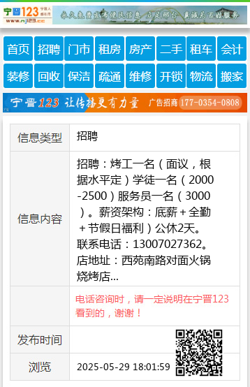 招聘: 烤工一名(面议,根据水平定) 学徒一名(2000-2500) 服务员一名(3000)。 薪资架构:底薪+全勤+节假日福利)公休2天。 联系电话:13007027362。 店地址:西苑南路对面火锅烧烤店