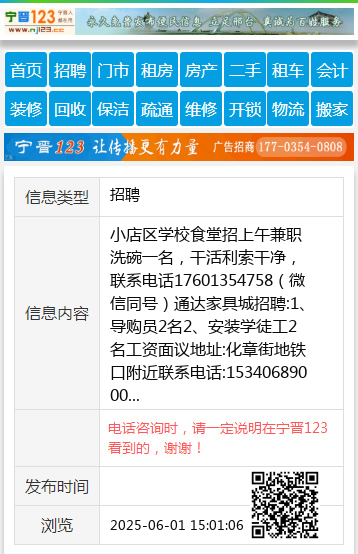小店区学校食堂招上午兼职洗碗一名,干活利索干净,联系电话17601354758(微信同号)