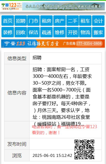招聘:面案帮厨一名,工资3000一4000左右,年龄要求30~50岁之间,男女不限。
