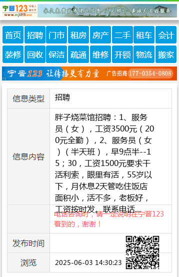 2、服务员(女)(半天班),早9点半--15;30,工资1500元要求干活利索,眼里有活,55岁以下,月休息2天管吃住