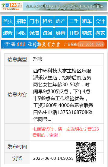 西中环科技大学主校区东服派乐汉堡店,招聘后厨店员两名女性年龄30-50岁,时间早9点30到2点,下午4点半到9点有工作经验优先,工资3600到4000有意者联系白先生电话13753168708微信同号 【电话咨询时,请一定说明在太原生活网看到的,谢谢!】 |