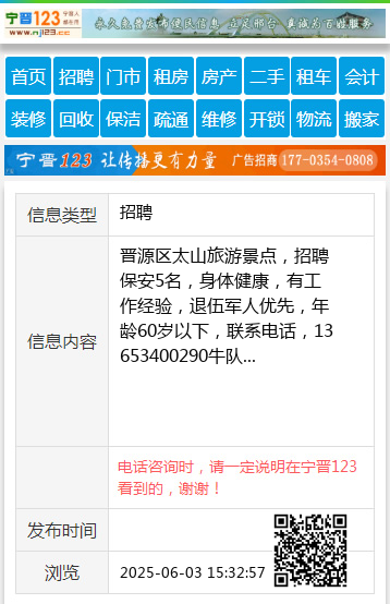 晋源区太山旅游景点,招聘保安5名,身体健康,有工作经验,退伍军人优先,年龄60岁以下,联系电话,13653400290牛队 【电话咨询时,请一定说明在太原生活网看到的,谢谢!】 |