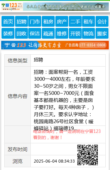 招聘:面案帮厨一名,工资3000一4000左右,年龄要求30~50岁之间,男女不限