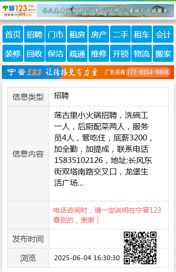 荡古里小火锅招聘,洗碗工一人,后厨配菜两人,服务员4人,管吃住,底薪3200,加全勤,加提成,联系电话15835102126,地址:长风东街双塔南路交叉口,龙堡生活广场 【电话咨询时,请一定说明在太原生活网看到的,谢谢!】 |