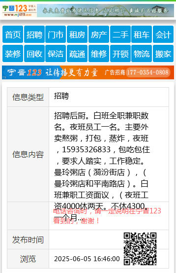 招聘后厨。白班全职兼职数名。夜班员工一名。主要外卖熬粥,打包,蒸炸,夜班,15935326833,包吃包住,要求人踏实,工作稳定。曼玲粥店(漪汾街店),(曼玲粥店和平南路店)。白班兼职工资面议,(夜班工资4000休两天。不休4300。一个月后有夜补300。工作时间晚上10:30——早上9:00。) 【电话咨询时,请一定说明在太原生活网看到的,谢谢!】 |