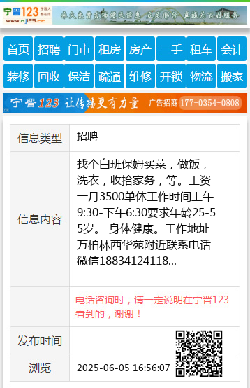 找个白班保姆买菜,做饭,洗衣,收拾家务,等。工资一月3500单休工作时间上午9:30-下午6:30要求年龄25-55岁。 身体健康。工作地址万柏林西华苑附近联系电话微信18834124118