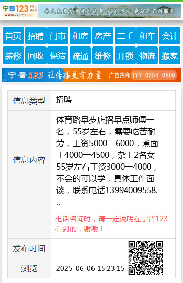 体育路早歺店招早点师傅一名,55岁左右,需要吃苦耐劳,工资5000一6000,煮面工4000一4500,杂工2名女55岁左右工资3000一4000,不会的可以学,具体工作面谈,联系电话13994009558 【电话咨询时,请一定说明在太原生活网看到的,谢谢!】 |