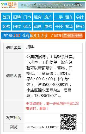 千千岁招聘 洗碗工 • 工作地点:食品街店、晋阳街店 • 待遇:月休3天,包吃住,工资4500元• 其他:不招暑期工服务员 • 工作地点:食品街店,中正天街店 • 要求:年满20岁 • 待遇:月休3天,包吃住,工资4500元 • 其他:不招暑期工厨房员工 • 工作地点:晋阳街店、食品街店 • 要求:年满20岁 • 待遇:月休3天,包吃住,工资4500元 • 其他:不招暑期工 联系电话:17703402656(微信同号)