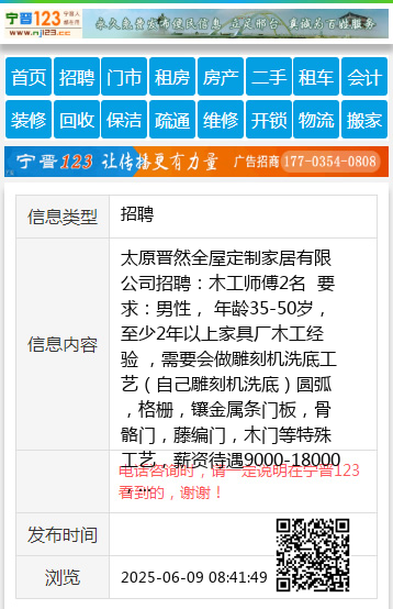 太原晋然全屋定制家居有限公司招聘:木工师傅2名 要求:男性, 年龄35-50岁,至少2年以上家具厂木工经验 ,需要会做雕刻机洗底工艺(自己雕刻机洗底)圆弧,格栅,镶金属条门板,骨骼门,藤编门,木门等特殊工艺,薪资待遇9000-18000,具体可面议。地址:山西省太原市尖草坪区绿果路3号太原晋然全屋定制工厂 联系电话:15267805102 刘先 【电话咨询时,请一定说明在太原生活网看到的,谢谢!】 |